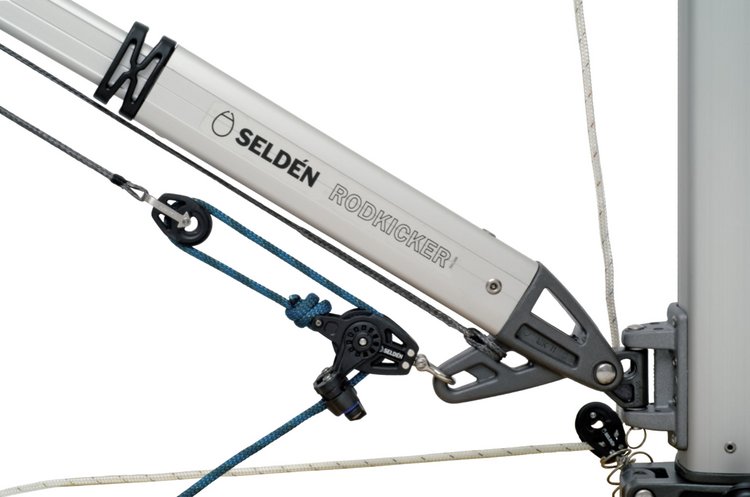 Der Rodkicker verhindert, dass der Baum unkontrolliert ins Cockpit oder auf das Deck fällt. Die integrierte 1:2 Drahtseil-Talje verstärkt die Niederholertalje. Die Gasdruckfedern können in die Seldén Rodkicker eingebaut werden. Damit kann der Baum durch fieren der Niederholertalje vor dem Wind angetoppt werden.